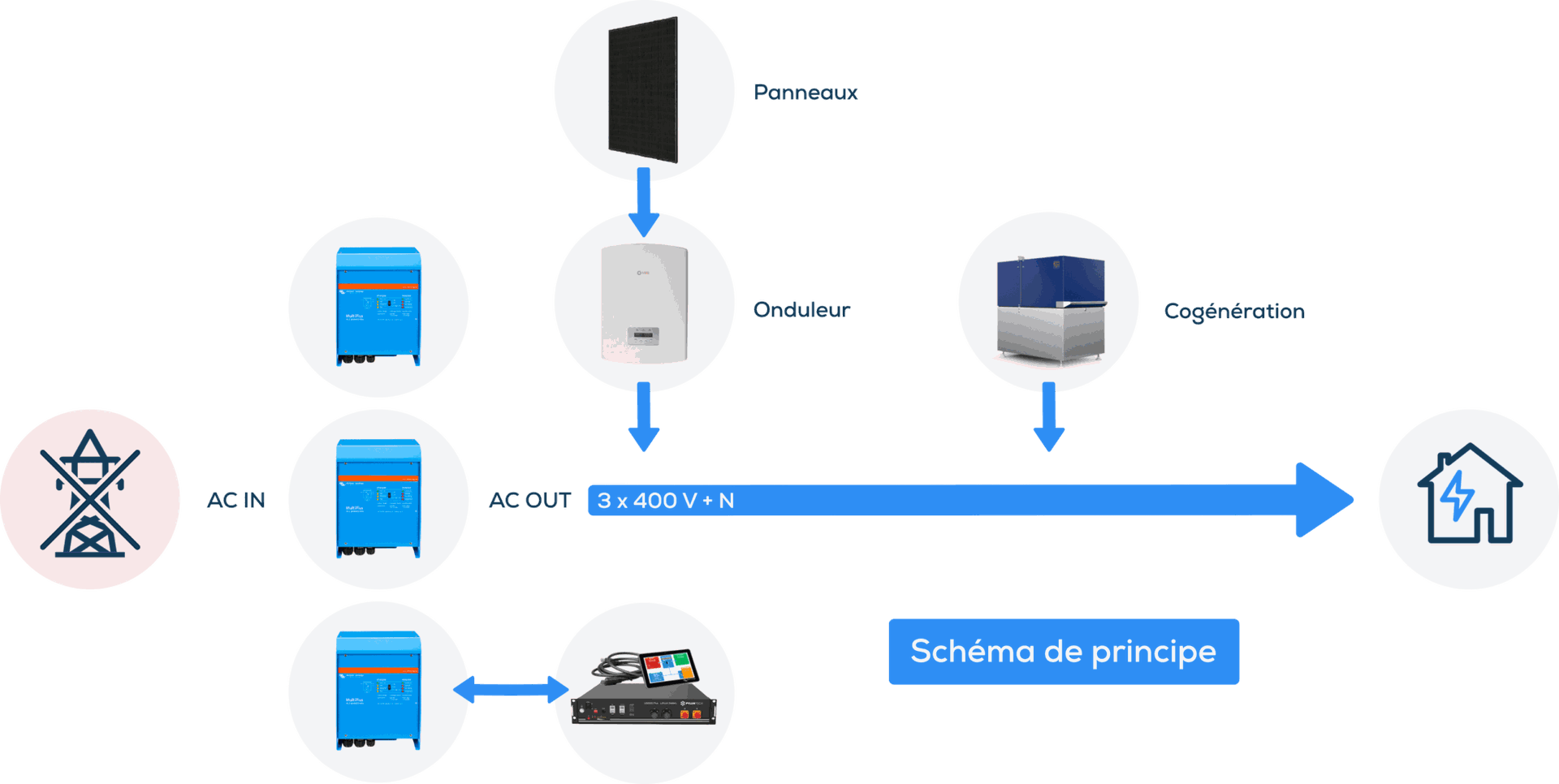 Ces installations sont munies d’un onduleur Victron, d’un onduleur photovoltaïque classique, une batterie Lithium, une cogénération ou un groupe de secours, un écran de supervision et un accès à distance via smartphone et site internet.